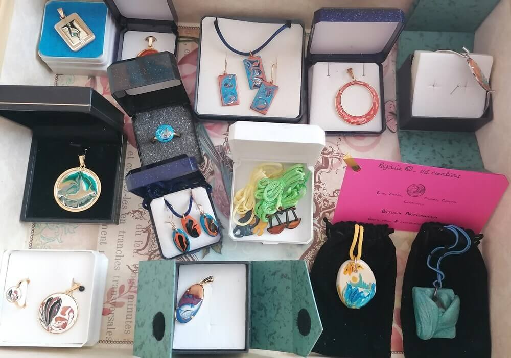 Chaque bijou est unique. Je n’en fabrique jamais deux pareils. De toute façon, étant donné la difficulté à émailler de si petits objets avec un émail délicat à positionner et manipuler, il m’arrive souvent de recommencer. Le plus difficile étant pour les boucles d’oreille qui sont « assorties » mais non point « identique » : mission impossible !